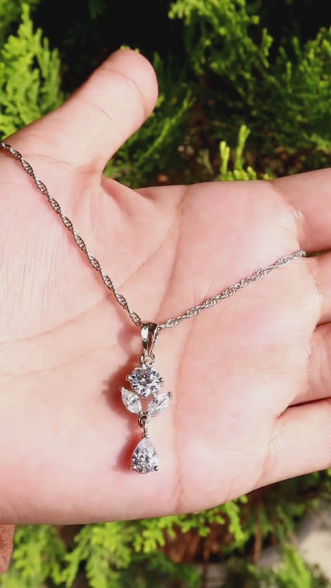 Silver Tales: Grand Narratives Crafted from Sparkling Sterling Silver. Presenting 925 Sterling Silver Spiral chain with Premium Multi Leaf Tear-Drop Zirconia Pendant. Unveiling Enigmatic Beauty, One Link at a Time.