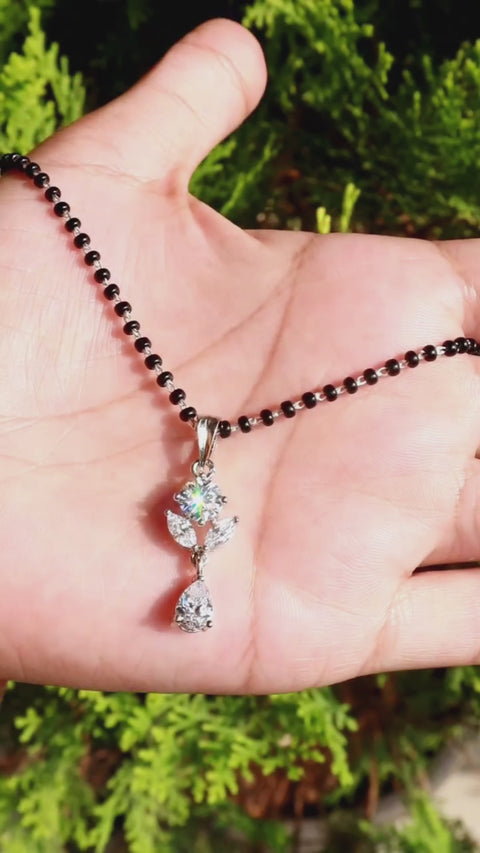 Silver Tales: Grand Narratives Crafted from Sparkling Sterling Silver. Presenting 925 Sterling Silver Mangalsutra with Premium Multi Leaf Teardrop Zirconia Pendant. Unveiling Enigmatic Beauty, One Link at a Time.
