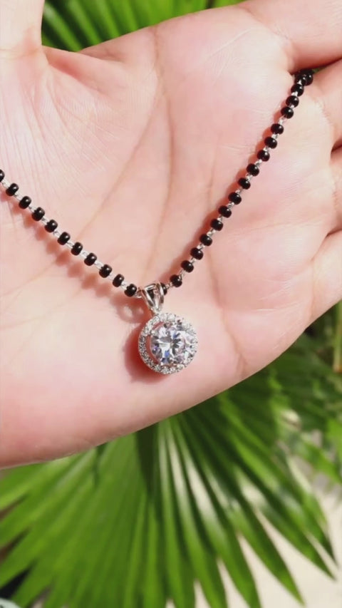 Adorn your look with our dazzling 92.5 Sterling Silver Mangalsutra and Premium Single Halo Round Zirconia Pendant, radiating stylish dreams.