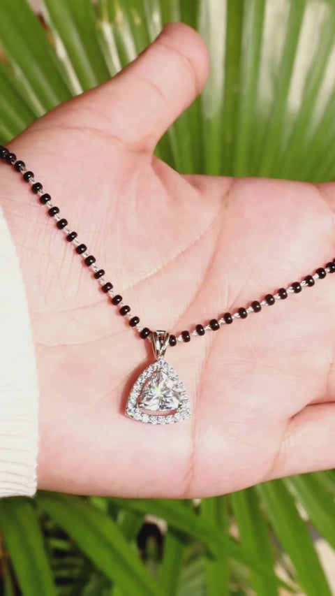 Embracing the Moonlight: Sterling Silver's Timeless Elegance. Presenting 925 Sterling Silver Mangalsutra featuring Single Halo Triangle Premium Zirconia Pendant.