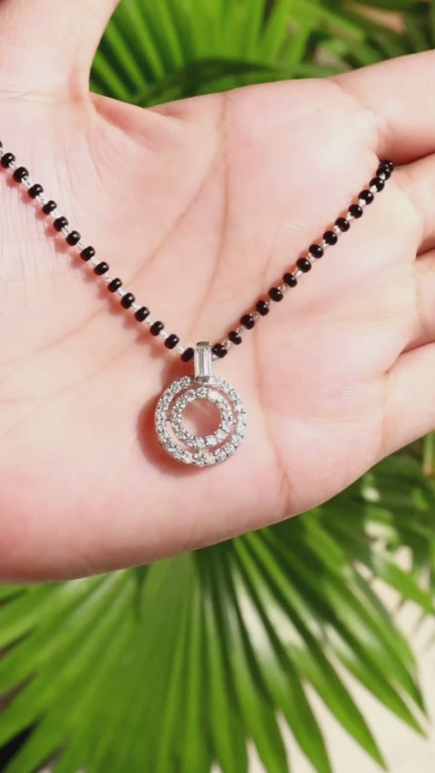 Embrace the timeless elegance of silver. Elevate your style with our exquisite 925 Sterling Silver Mangalsutra with Premium Concentric Double Circle Zirconia Pendant.